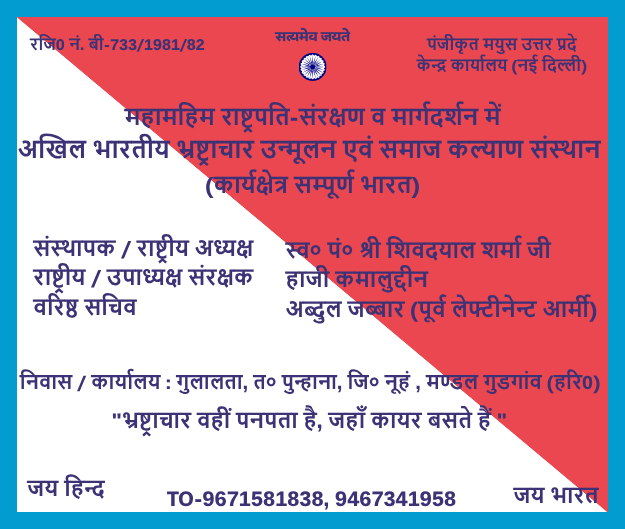 अखिल भारतीय भ्रष्टाचार उन्मूलन एवं समाज कल्याण संस्थान is on a mission to dismantle corruption at every level—working hand in hand with citizens and authorities to bring fairness, accountability, and dignity to all.